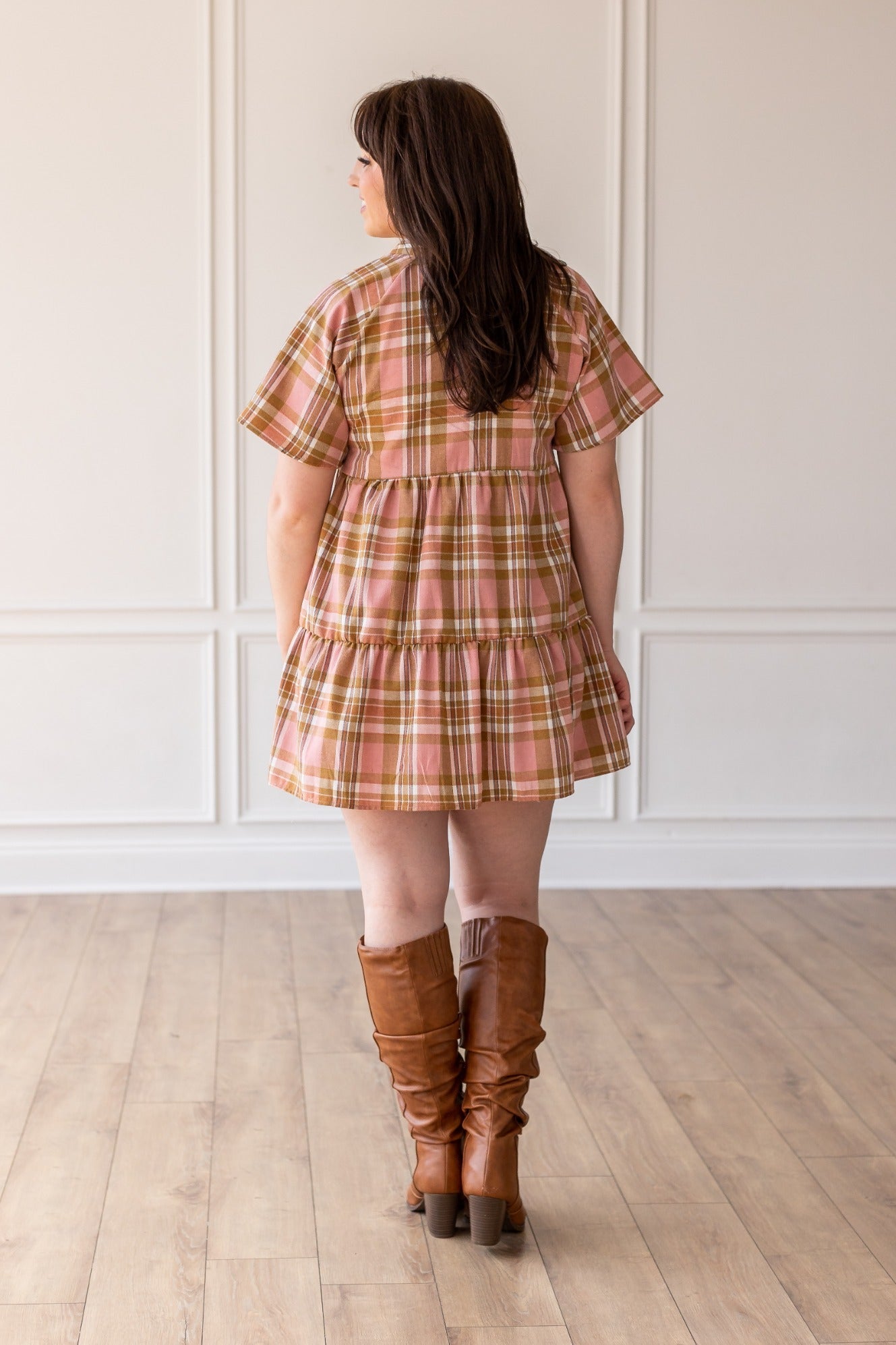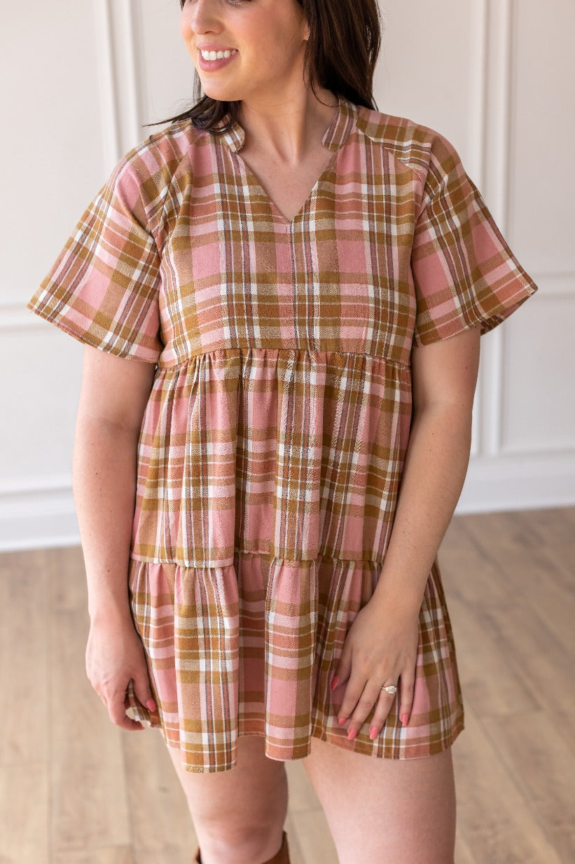 A Walked Through the Leaves Plaid Flutter Sleeve Dress