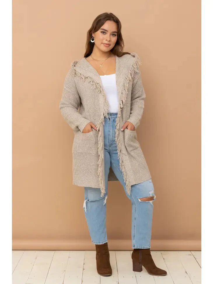 ALL SIZES- Hooded Fringe Knit Open Cardigan