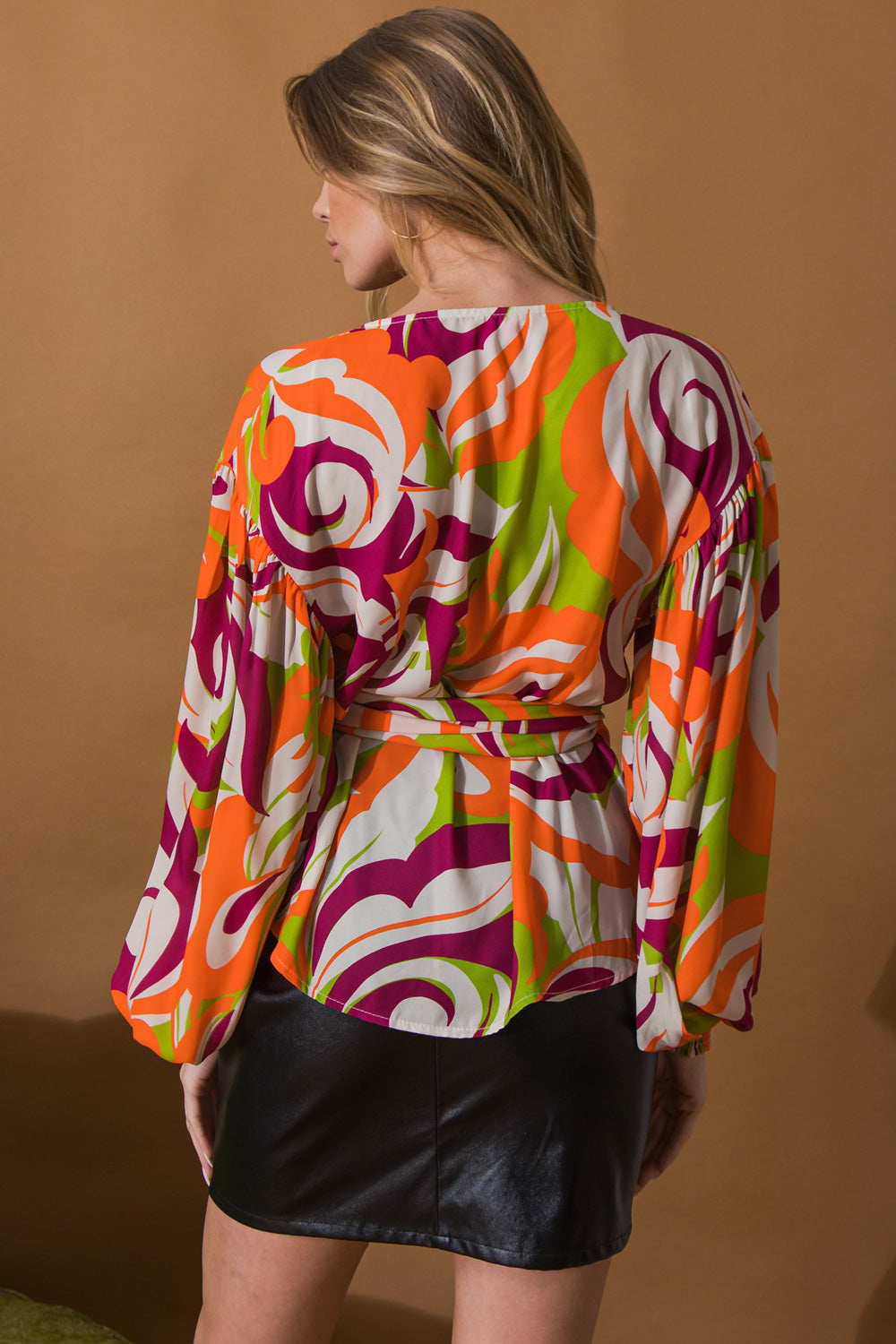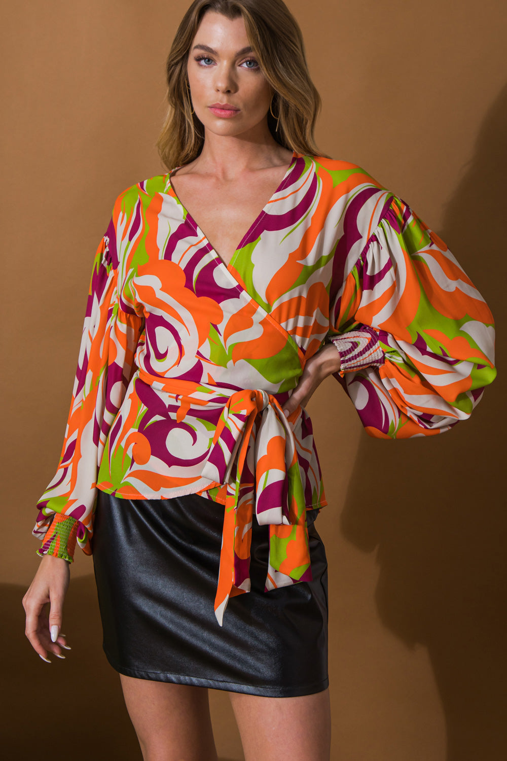 This ALL THE LUXE WOVEN TOP is crafted from lightweight and breathable fabric with a printed design. It features a surplice neckline, true wrap style, and flattering peplum hem, all accented with a self sash tie. Perfect for adding a chic and stylish touch to any outfit.