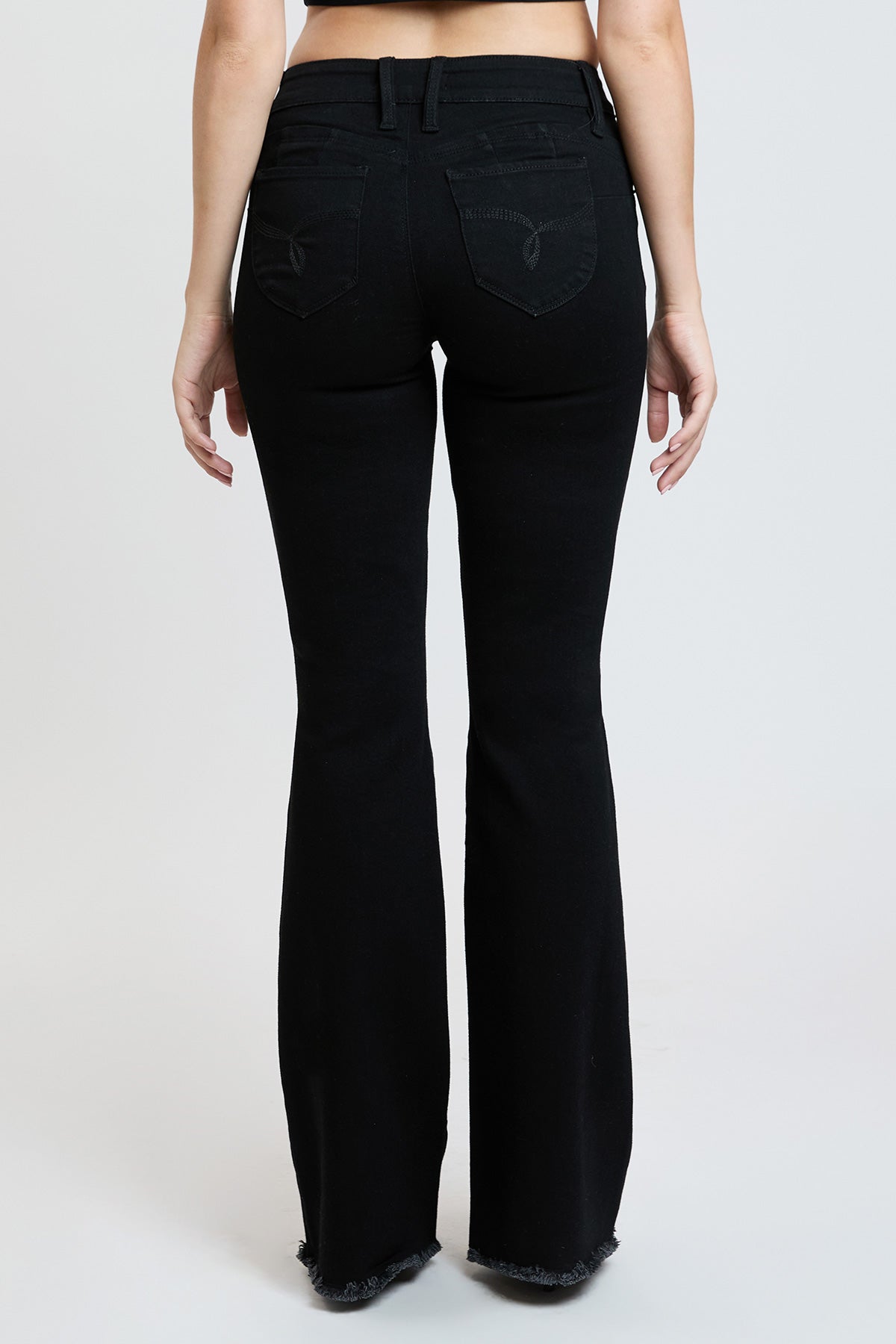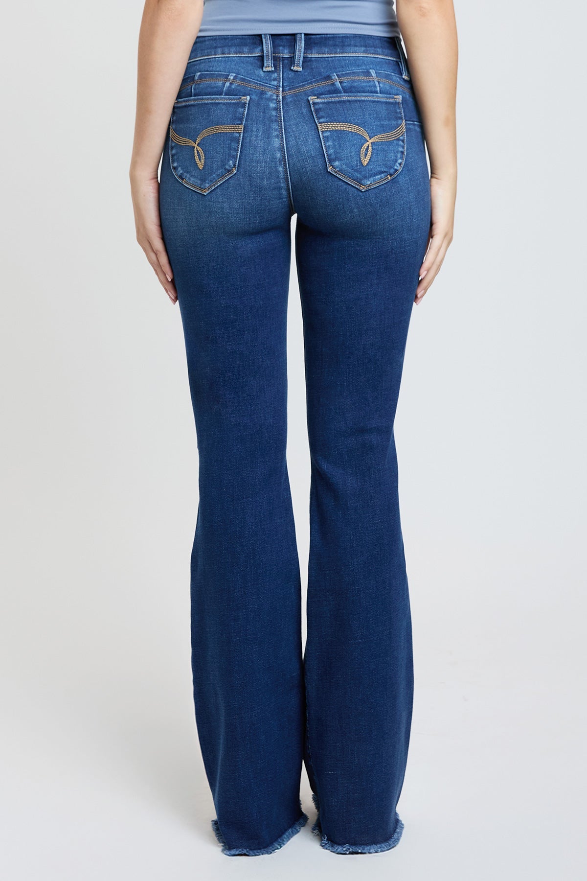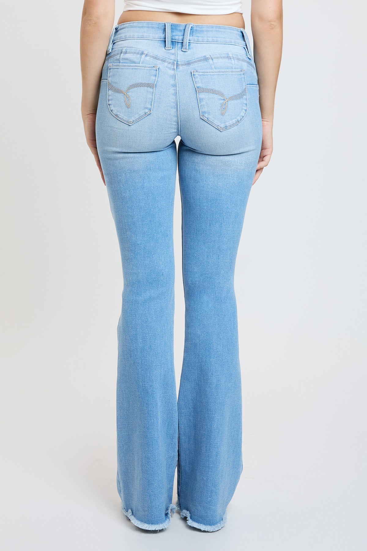 Take our Women's WannaBettaButt High-Rise Flare jean out on the town! These flared jeans feature our signature WBB heart-shaped stitching and uniquely crafted pockets for a natural butt-lift that you'll love. Made with recycled fibers because earth is bae <3. Detailed with a frayed and flared hem, light whiskering, and a distressed front. Style with a bodysuit and heels for a sultry vibe!
