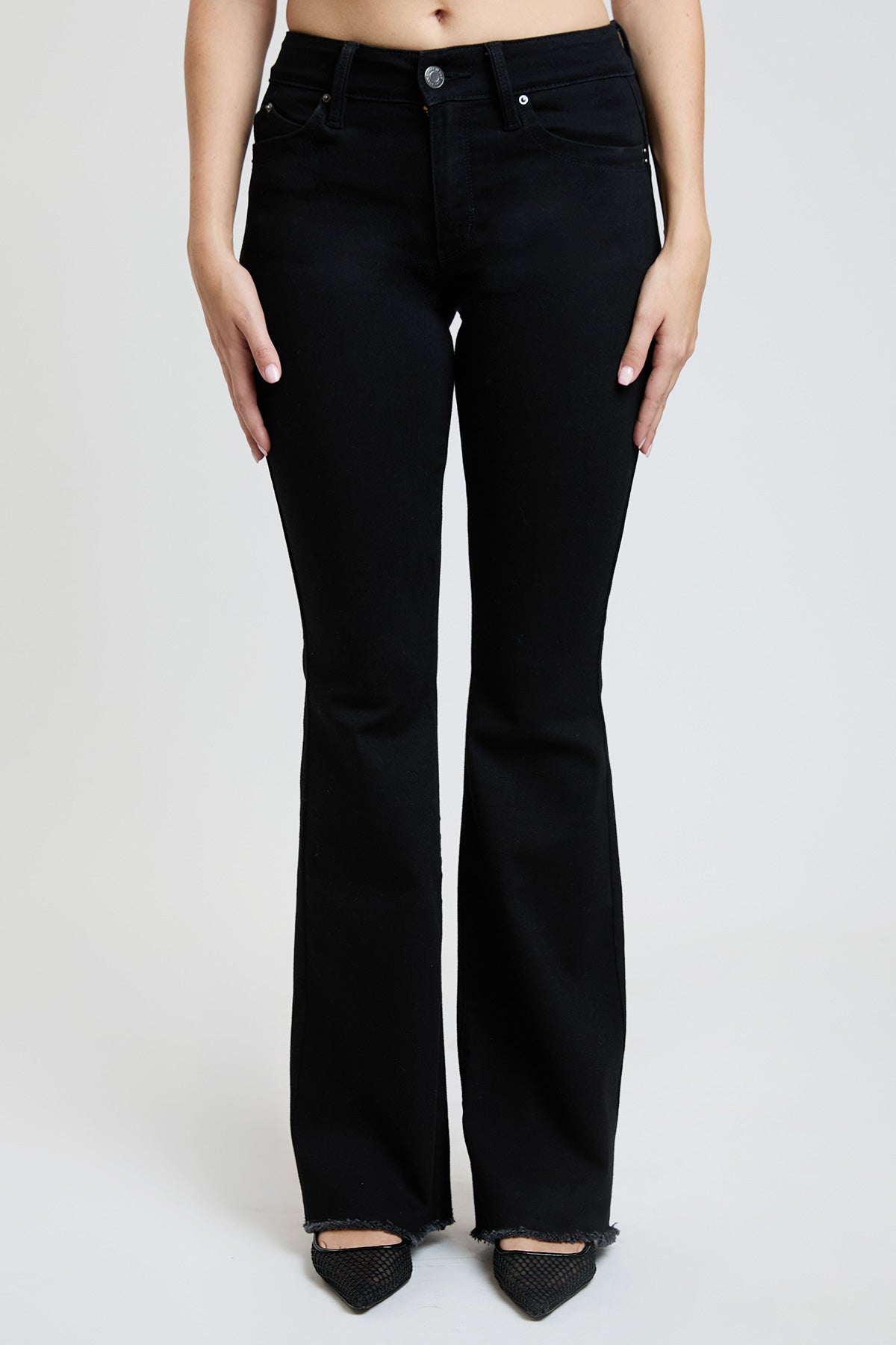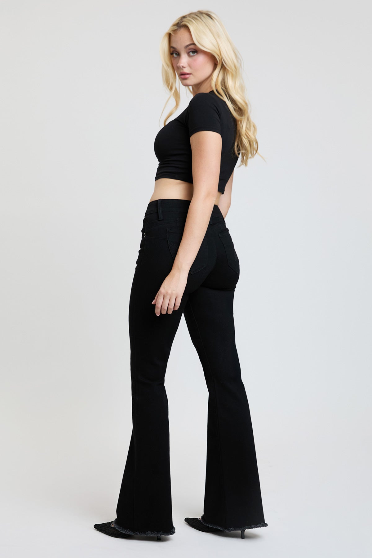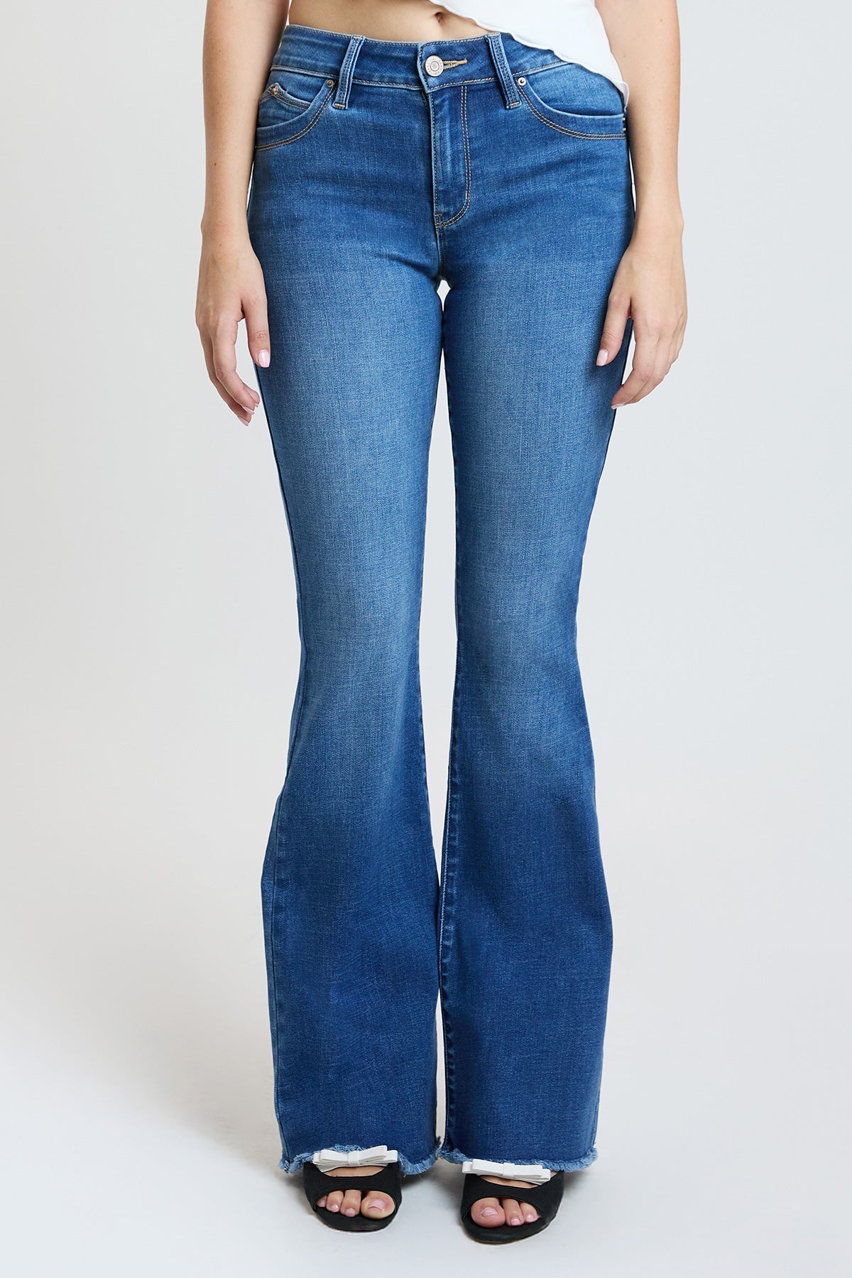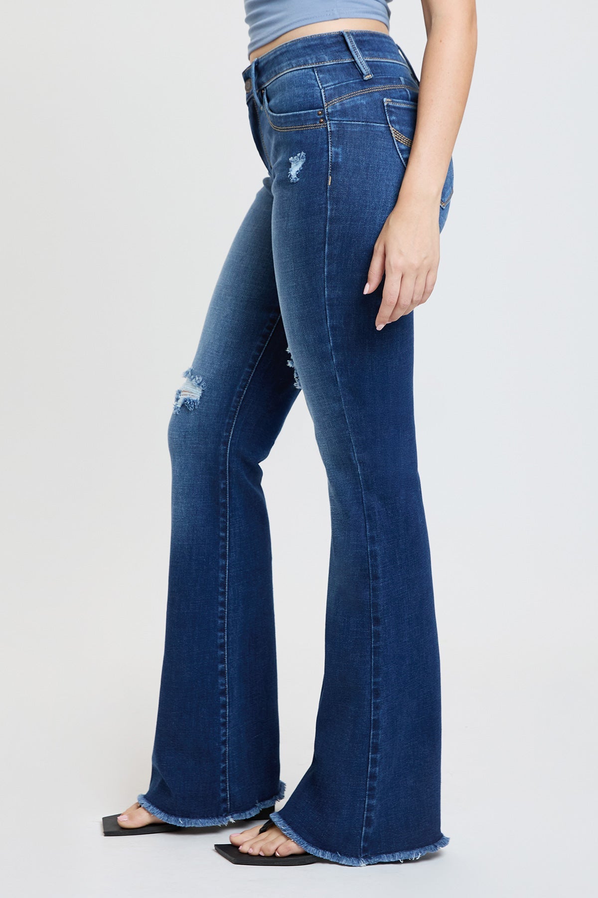 Take our Women's WannaBettaButt High-Rise Flare jean out on the town! These flared jeans feature our signature WBB heart-shaped stitching and uniquely crafted pockets for a natural butt-lift that you'll love. Made with recycled fibers because earth is bae <3. Detailed with a frayed and flared hem, light whiskering, and a distressed front. Style with a bodysuit and heels for a sultry vibe!