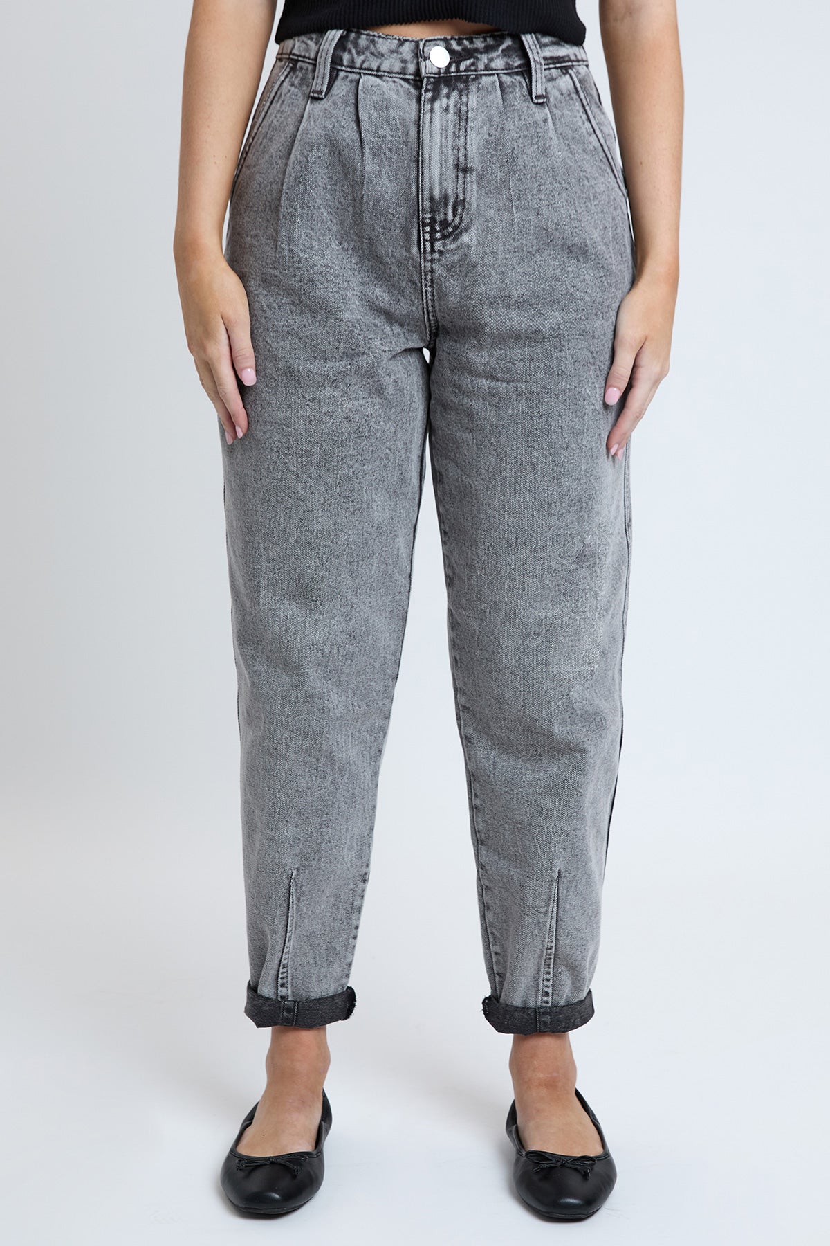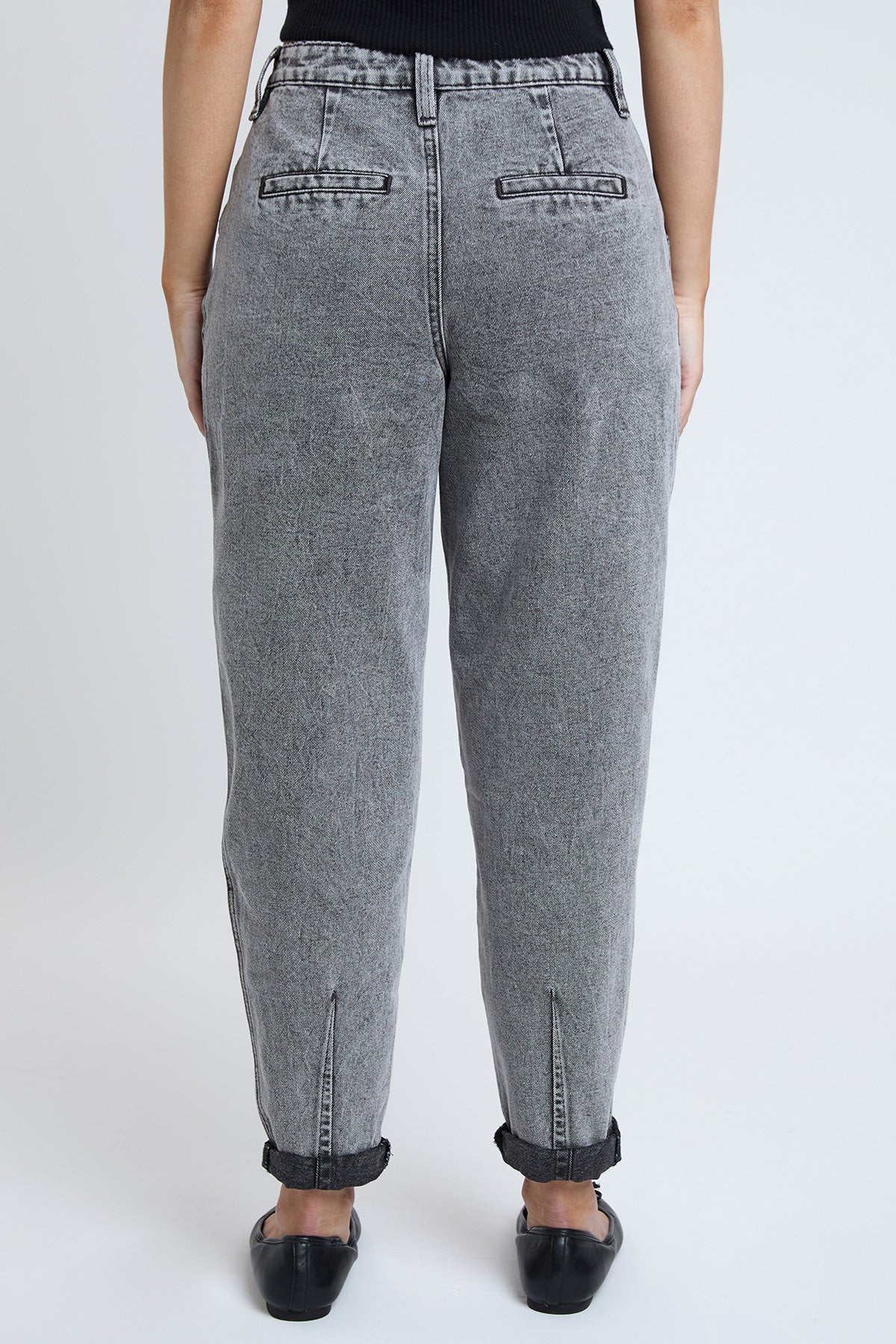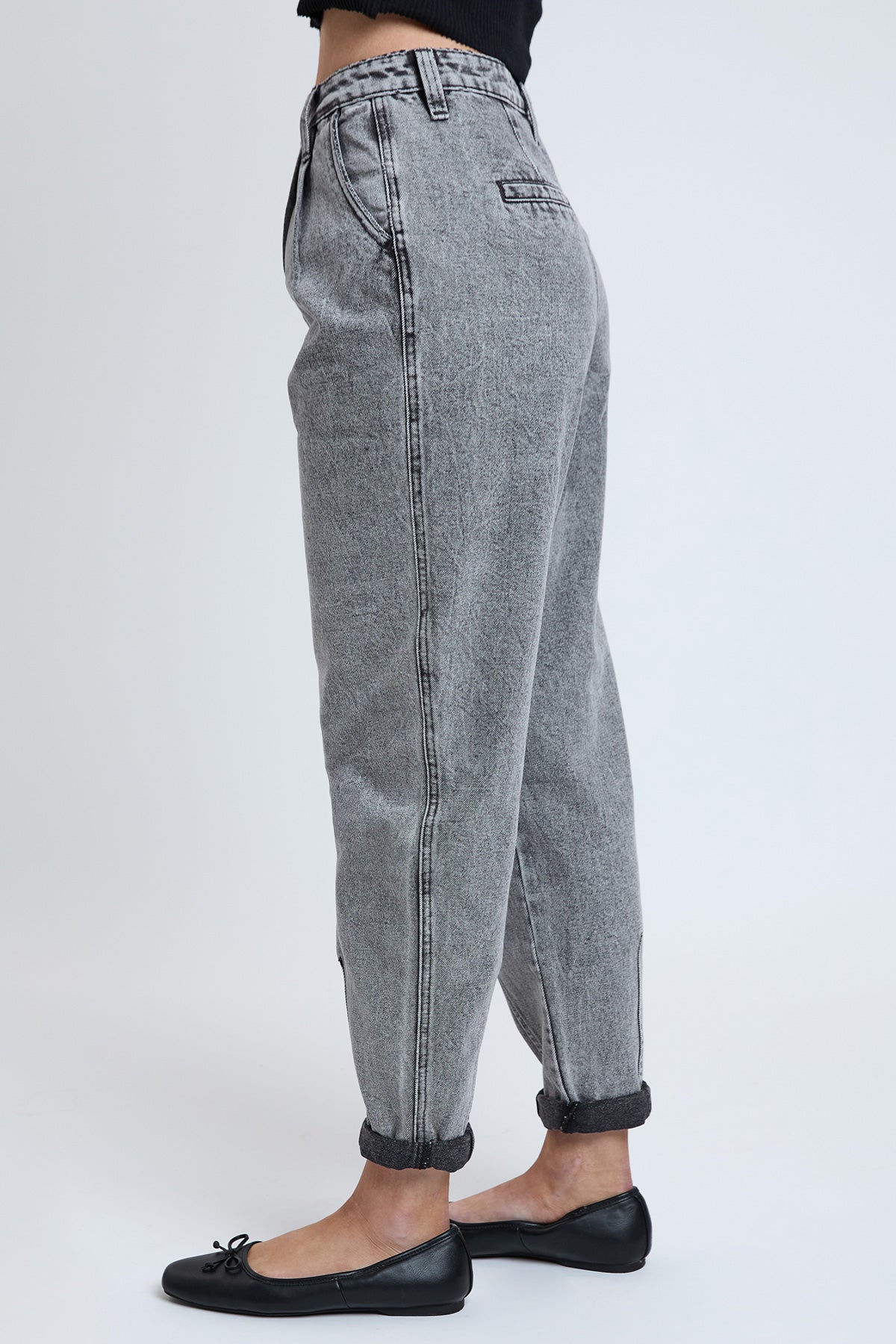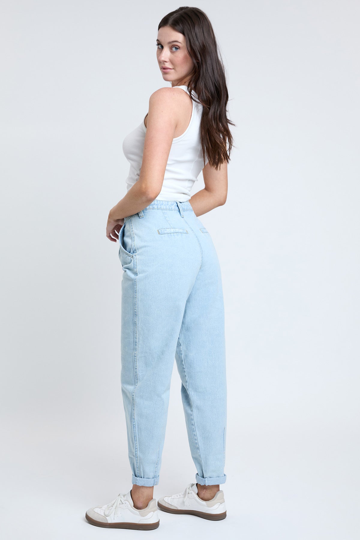 The ultimate pair of vintage-inspired jeans! Our Women's Pleated Mom Jeans are a must-have featuring a high-waist and an exaggerated barrel silhouette. You’ll be sure to make a statement in these! Also featuring a tapered leg, an ankle-length crop, and a cuffed hem for an effortlessly cool look. Since these jeans make a statement, they look amazing with simple pieces like a basic tee! For some extra drama, layer over a trench coat and add some bold heels!