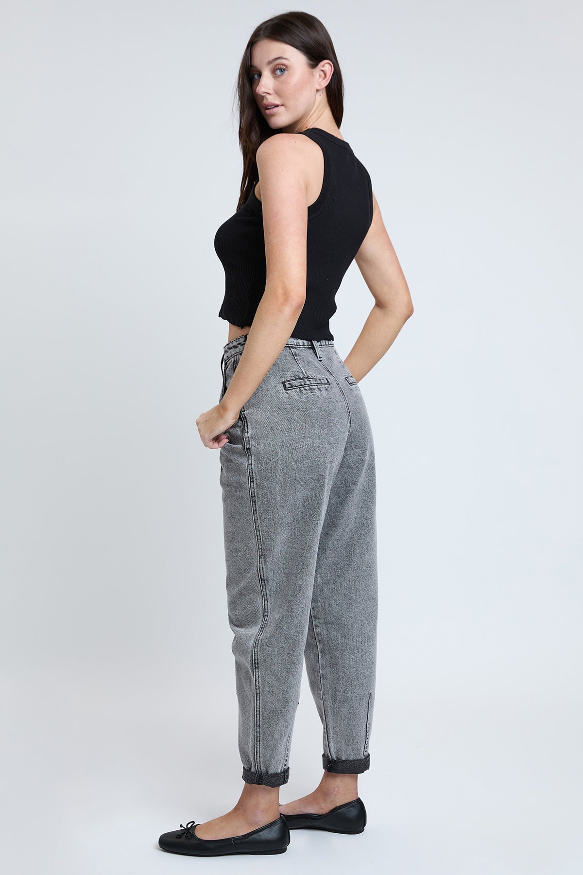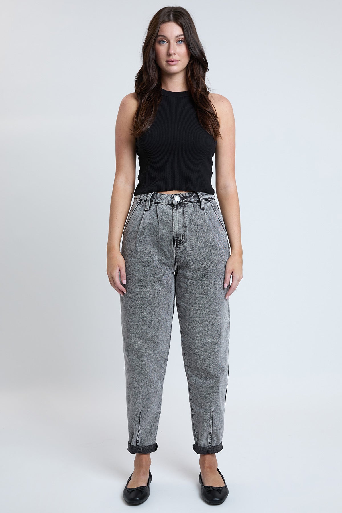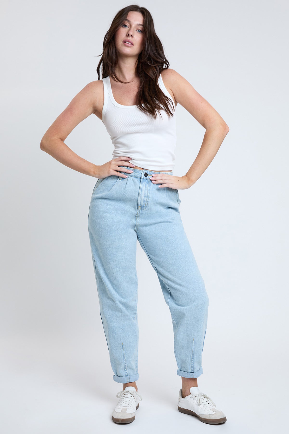 The ultimate pair of vintage-inspired jeans! Our Women's Pleated Mom Jeans are a must-have featuring a high-waist and an exaggerated barrel silhouette. You’ll be sure to make a statement in these! Also featuring a tapered leg, an ankle-length crop, and a cuffed hem for an effortlessly cool look. Since these jeans make a statement, they look amazing with simple pieces like a basic tee! For some extra drama, layer over a trench coat and add some bold heels!