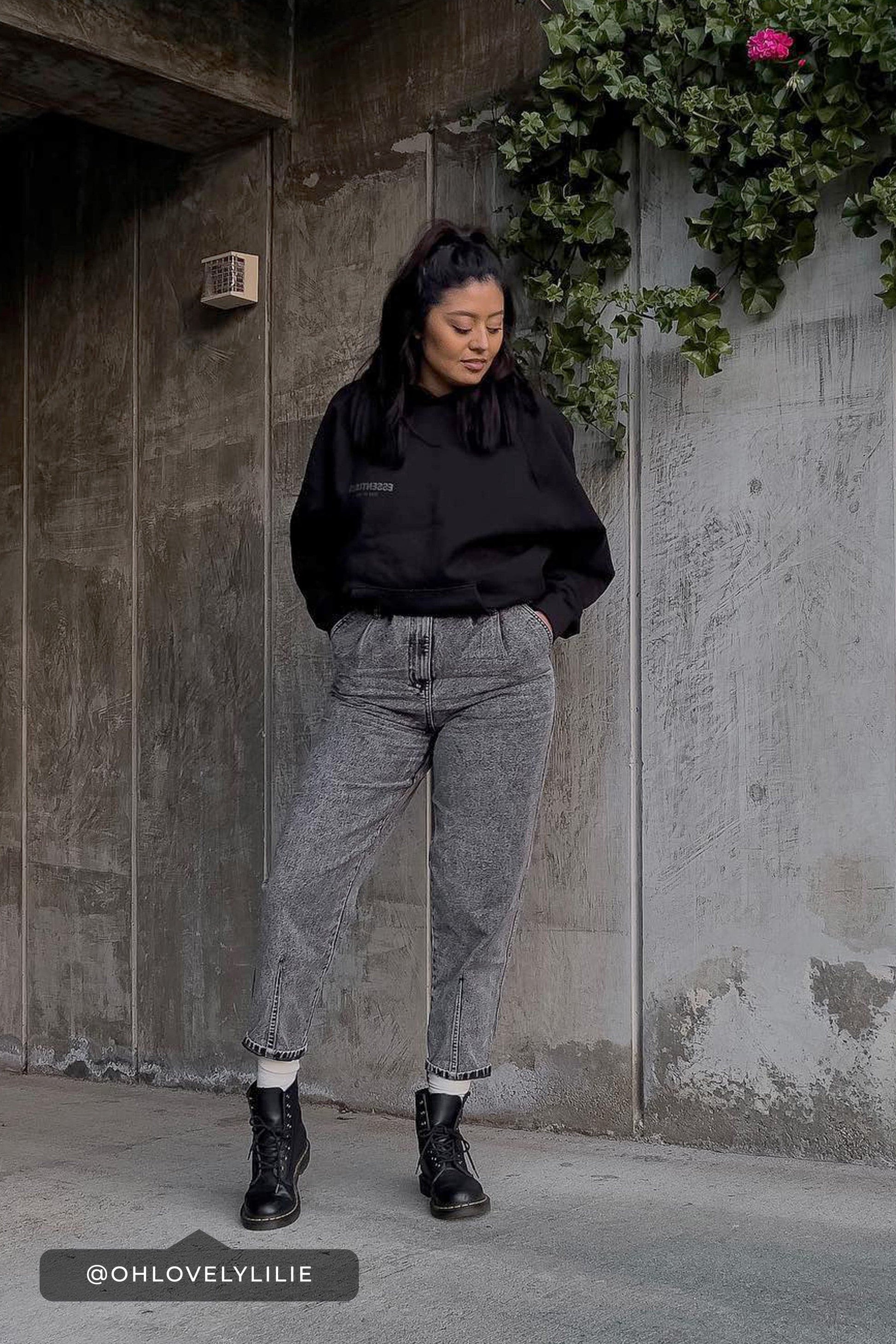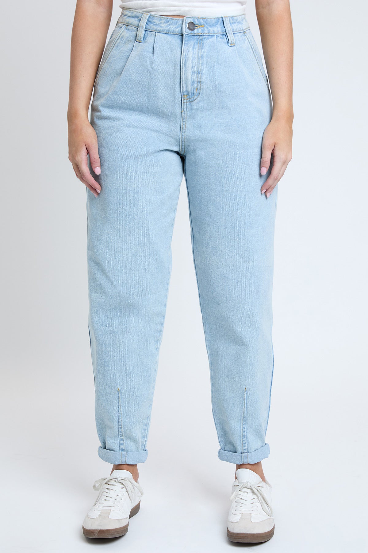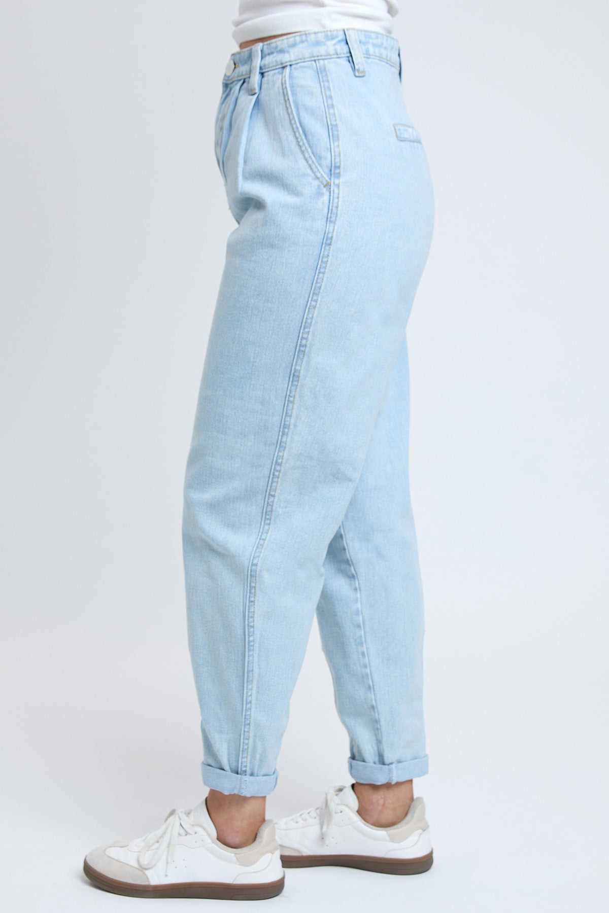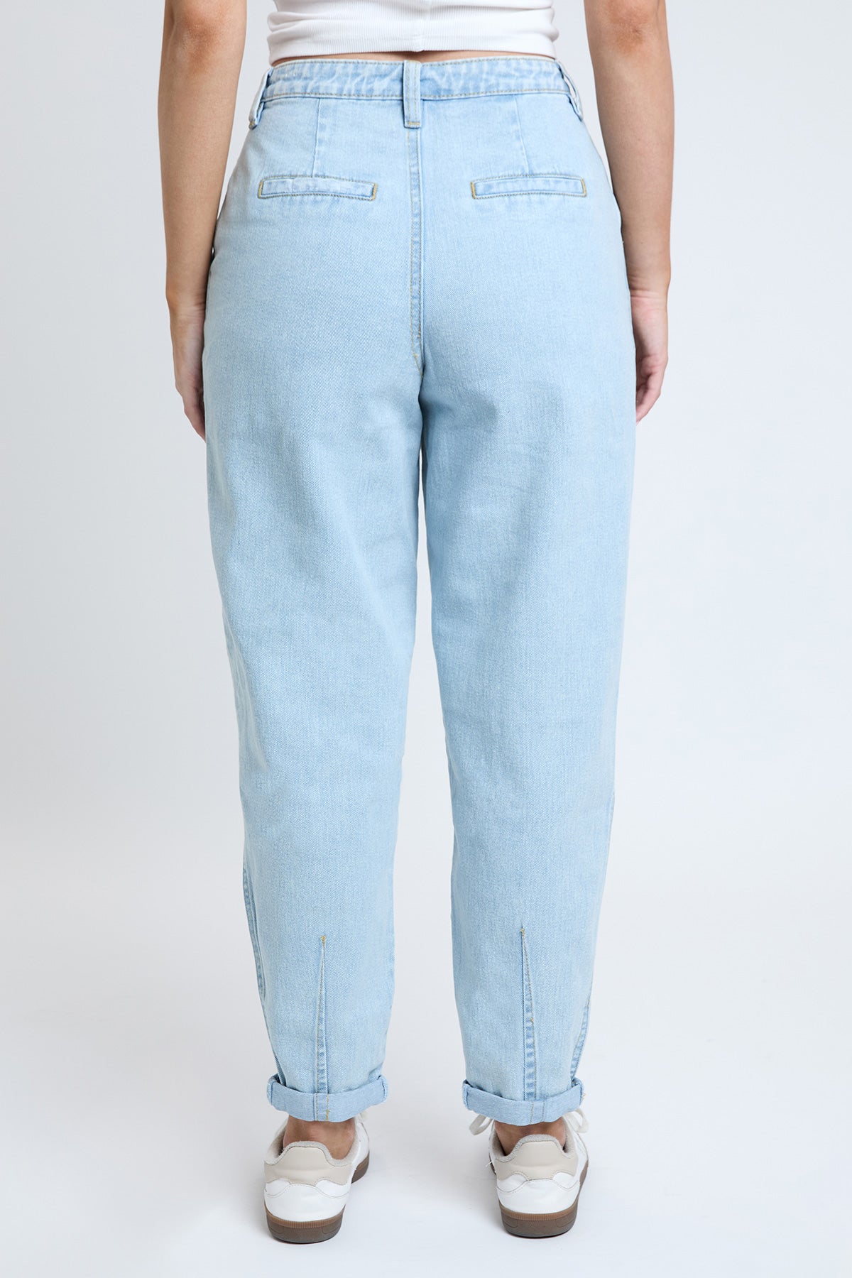 The ultimate pair of vintage-inspired jeans! Our Women's Pleated Mom Jeans are a must-have featuring a high-waist and an exaggerated barrel silhouette. You’ll be sure to make a statement in these! Also featuring a tapered leg, an ankle-length crop, and a cuffed hem for an effortlessly cool look. Since these jeans make a statement, they look amazing with simple pieces like a basic tee! For some extra drama, layer over a trench coat and add some bold heels!