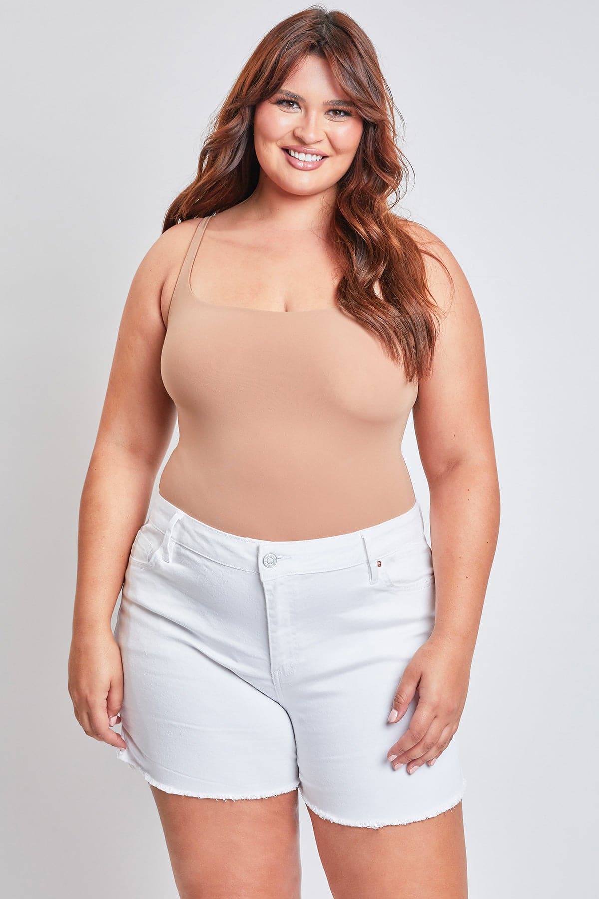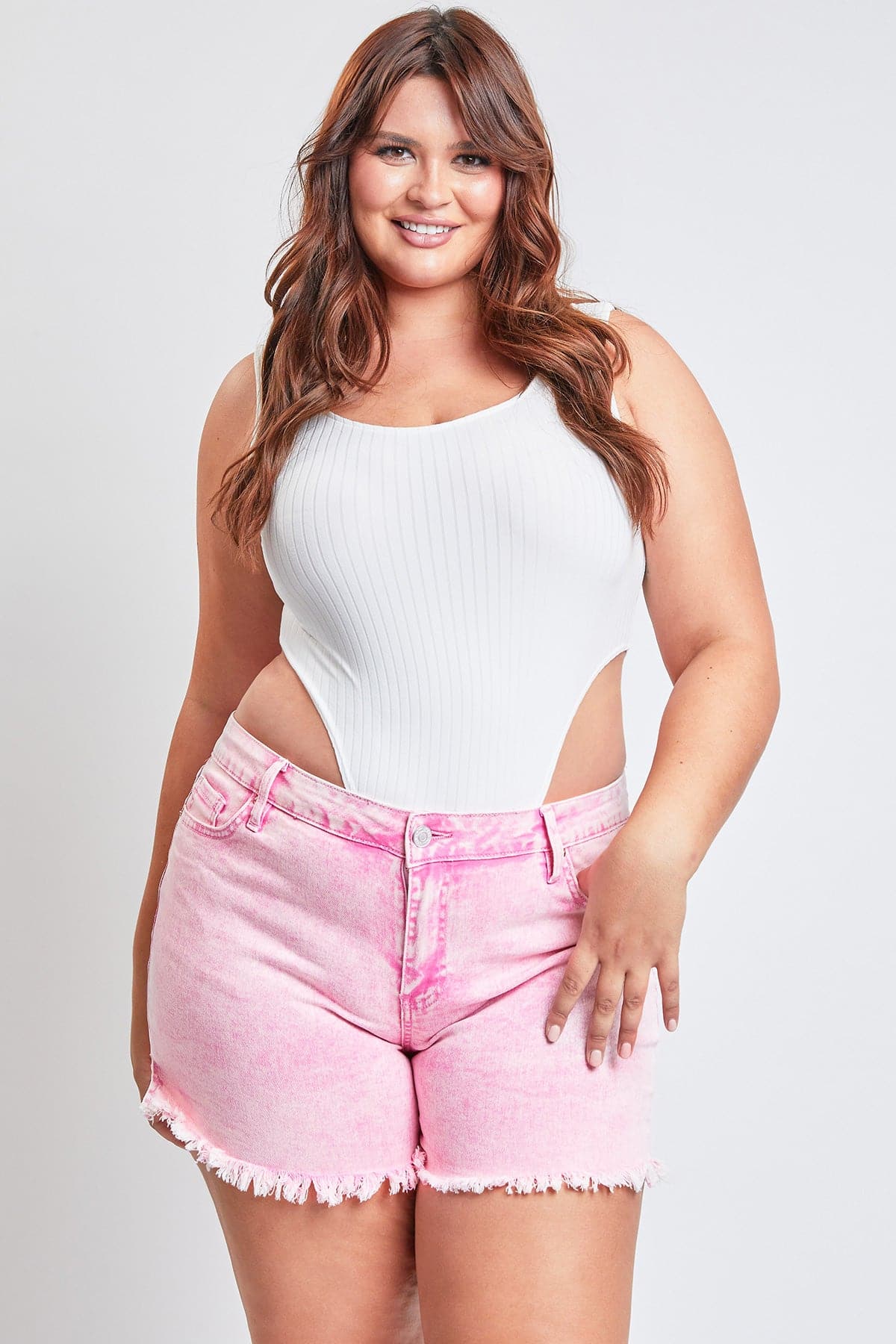 Stand out this Summer in our Women's Plus Essential High-Rise 80's Acid Wash Mom Short! These denim 80's mom shorts feature a flattering high-rise waist, and the acid wash detailing gives them a cool, retro look. Featuring frayed hems & side slit detailing. Style with your favorite tee and sneakers for a cute, laid-back ‘fit.