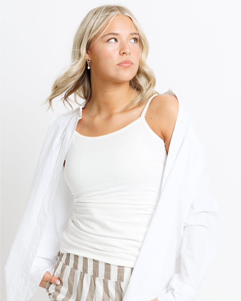 Our Wonder Cami tank top is the perfect layering basic. Layered best under dresses and lower cut tops.